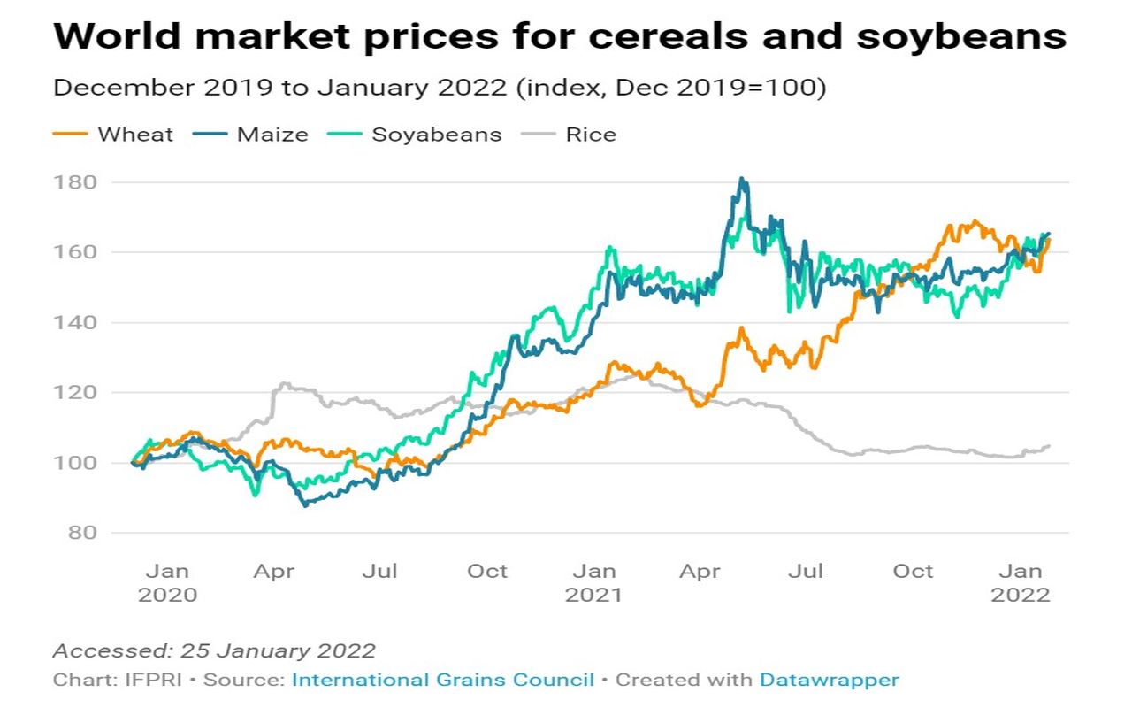 Abb 2: Weltmarktpreise für Getreide und Sojabohnen, Dezember 2019 bis Januar 2022 (Index Dez 2019 = 100) Quelle: International Grains Council 2022 © IFPRI 2022