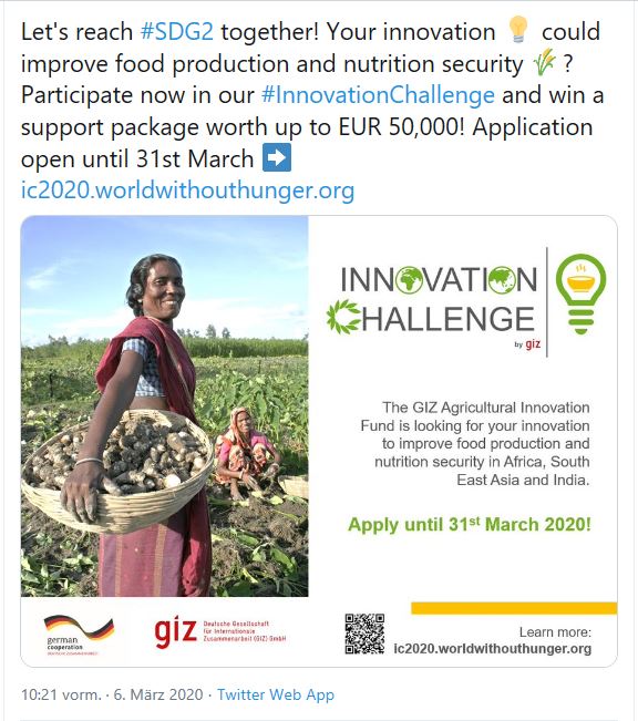 Soziale Medien, wie hier ein Beitrag der GIZ auf Twitter, standen im Fokus der Kommunikations-strategie der Innovation Challenge; Ziel war es, besonders auch Frauen mit dem Ideenwettbe-werb anzusprechen.
