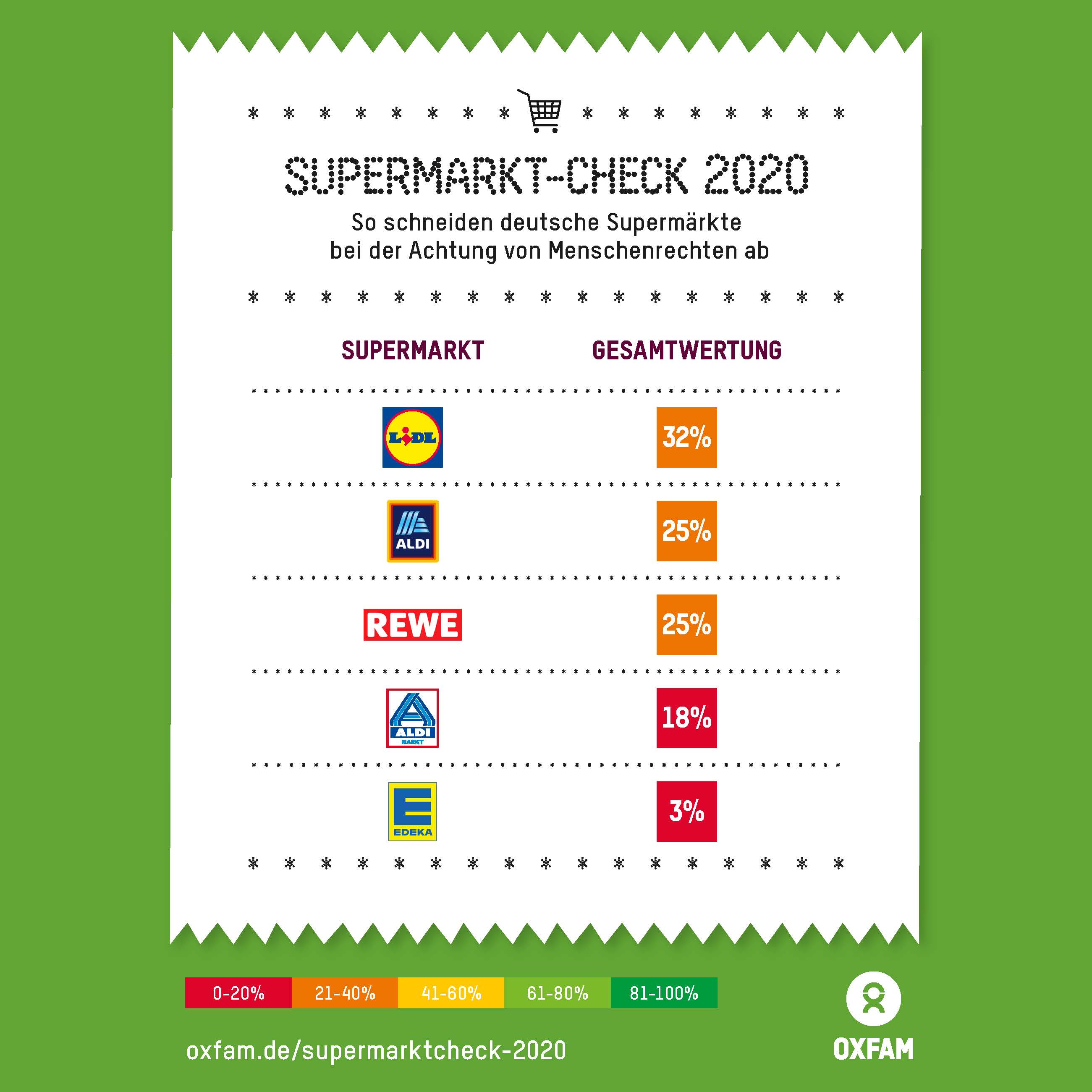 Seit 2018 analysiert Oxfams jährlich erscheinender Supermarkt-Check die Menschenrechtspolitik der größten Supermarktketten in Deutschland, Großbritannien, den Niederlanden und den USA. Auf Grundlage internationaler Standards wie den UN-Leitprinzipien für Wirtschaft und Menschenrechte und den Leitfäden der OECD hat Oxfam dafür knapp 100 Bewertungskriterien entwickelt.