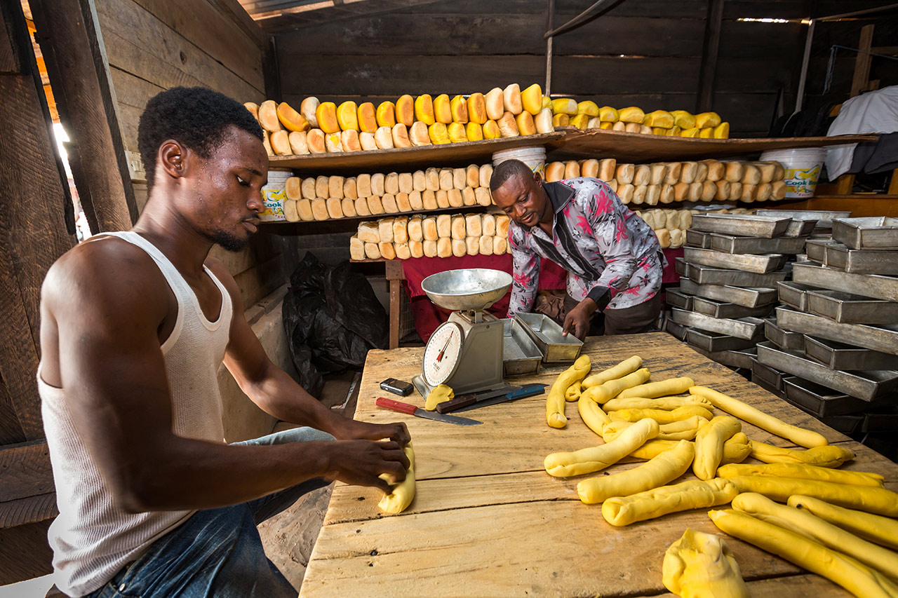 Kneading bread dough and placing it in the baking molds - snapshot in a bakery in Ghana. Photo: Frank Schultze / Zeitenspiegel