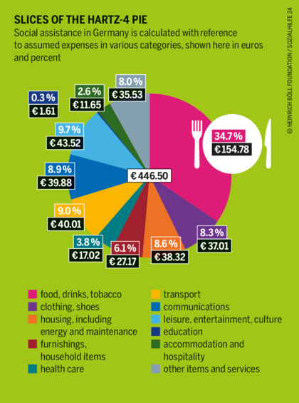 Poverty is a health risk. Someone is regarded as at risk of poverty if their income is less than 60 percent of the national median. In March 2020, 6.48 million people in Germany lived off unemployment or Hartz-IV social security benefits, including 1.87 million children and young people. For adults living alone, the basic monthly benefit in 2020 was 432 euros. That included a food allowance of 150 euros a month, or about 5 euros a day. To make ends meet, poor households tend to buy less food, or food of low quality.