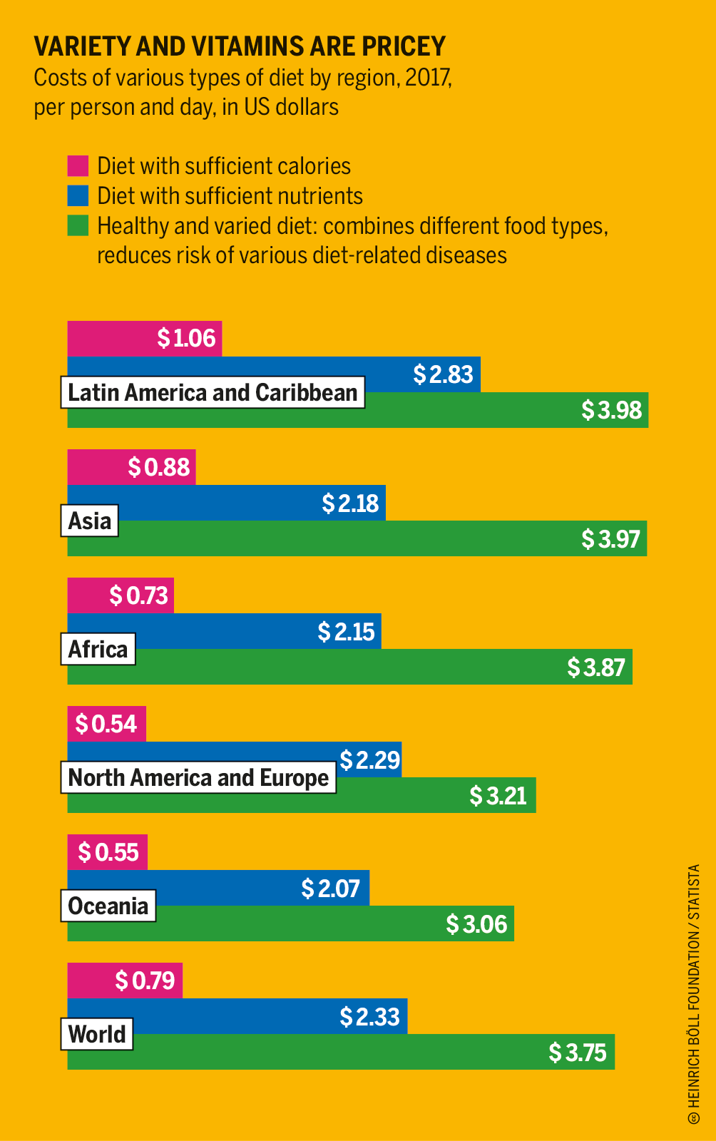 Around the world, 3 billion people cannot afford a healthy diet. On a global average, it costs 79 US cents to supply a person with an adequate number of calories. It costs 2.33 US dollars to provide the same person with a diet that takes into his or her nutritional needs apart from calories. A healthy and varied diet that combines various types of food and that prevents deficiency symptoms and long-term nutrition-related diseases costs at least 3.75 US dollars per person per day. According to a United Nations report, only half of the world’s population can afford a healthy diet that would prevent malnutrition.