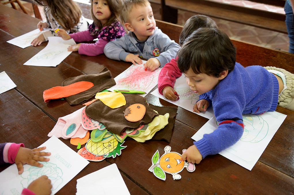 „Hallo Tomate!“, sagt die grüne Handpuppe. „Hallo Apfel!“, entgegnet die rote. Was dann folgt, ist eine laute, nicht immer ganz verständliche Unterhaltung zwischen den beiden Filzgestalten, denen der zweijährige Derick fantasievoll Leben verleiht. Ein paar Mädchen malen derweil Zeichenvorlagen aus und kichern über ihre rosa Äpfel und die Ananas in den Farben des Regenbogens. So lustig kann das Thema gesunde Ernährung sein. Zumindest wenn man so engagiert und einfallsreich ist, wie die Erzieherinnen im Kindergarten „Schneewittchen“ in der südbrasilianischen Kleinstadt Canguçu. Ein Klopfen an der Tür unterbricht das fröhliche Treiben. Die Mitglieder der Kooperative União sind wie jeden Dienstag gekommen und liefern ihre Waren frisch vom Feld für das Mittagessen an. Knackige Salate, Pfirsiche mit roten Bäckchen und frische Möhren werden in die Speisekammer getragen, wo Köchin Claudia Schiavon sie flink am richtigen Platz verstaut. „Sie sind immer frisch, haben mehr Nährstoffe und schmecken viel besser als das Zeug aus dem Supermarkt“, sagt Schiavon. „So lernen die Kinder von klein auf, sich gesund zu ernähren. Damit legen wir den Grundstein für ihr weiteres Leben.“
