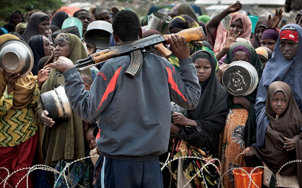 Somalia, Mogadishu / Die Lebensmittelverteilungen für IDPs werden von bewaffneter Security gesichert.