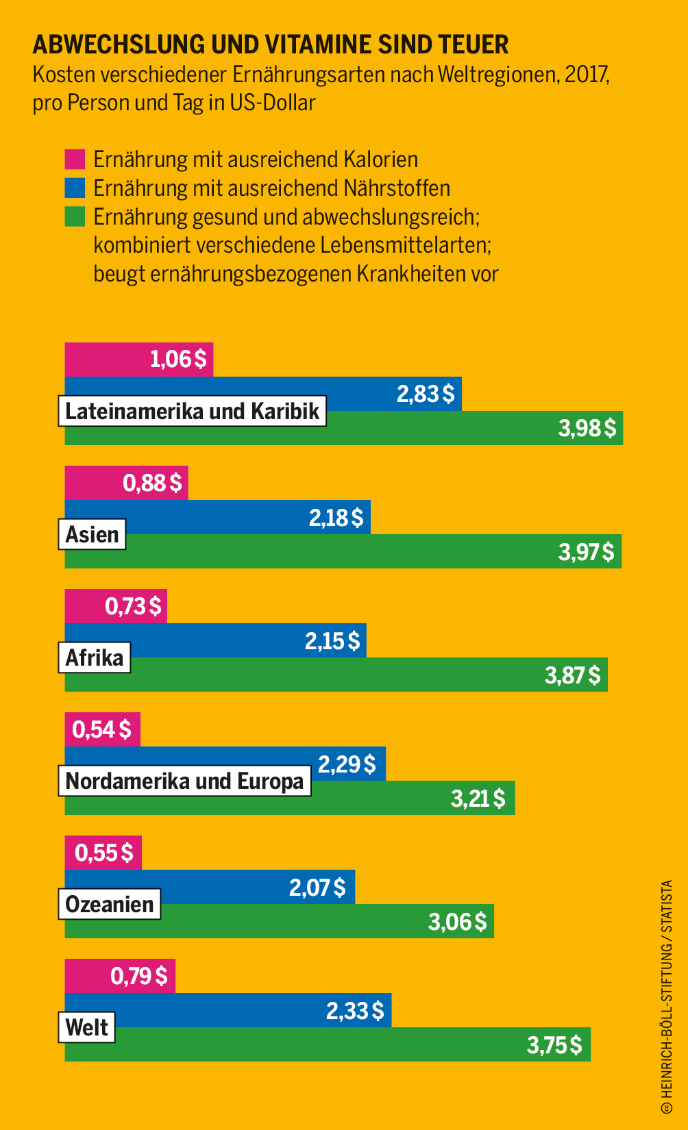 Weltweit können sich mehr als drei Milliarden Menschen keine gesunde Ernährung leisten. Im globalen Durchschnitt kostet es 0,79 US-Dollar, um eine Person für einen Tag mit ausreichend Kalorien zu versorgen. Der Preis für eine Ernährung, die außer Kalorien auch den Nährstoffbedarf berücksichtigt, liegt bei 2,33 US-Dollar. Eine gesunde und abwechslungsreiche Ernährung, die verschiedene Lebensmittelarten kombiniert und neben Mangelerscheinungen auch langfristig ernährungsbezogenen Krankheiten vorbeugt, kostet pro Tag und Kopf mindestens 3,75 US-Dollar. Laut einem Bericht der UN ist eine gesunde Ernährung, die Mangelernährung vorbeugen würde, für fast die Hälfte aller Menschen weltweit unerschwinglich.