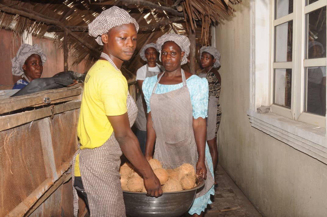 Wir beziehen einen Teil unseres Rohmaterials von lokalen Bauern und von anderen Bauern in Westafrika. In der Wertschöpfungskette der Kokosnuss steckt eine Menge Reichtum, der derzeit exportiert wird. Unsere Aufgabe ist es, diesen Reichtum an die Landwirt*innen in Nigeria weiterzugeben. Damit haben wir mit der Unterstützung des Projekts Skalierung von digitalen Agrarinnovationen durch Start-ups (SAIS) der Deutschen Gesellschaft für Internationale Zusammenarbeit (GIZ) begonnen. Wir haben eine Gärtnerei eingerichtet, in der die Bauern Kokosnuss-Setzlinge von uns abholen können, um dann in die Wertschöpfungskette einzusteigen.