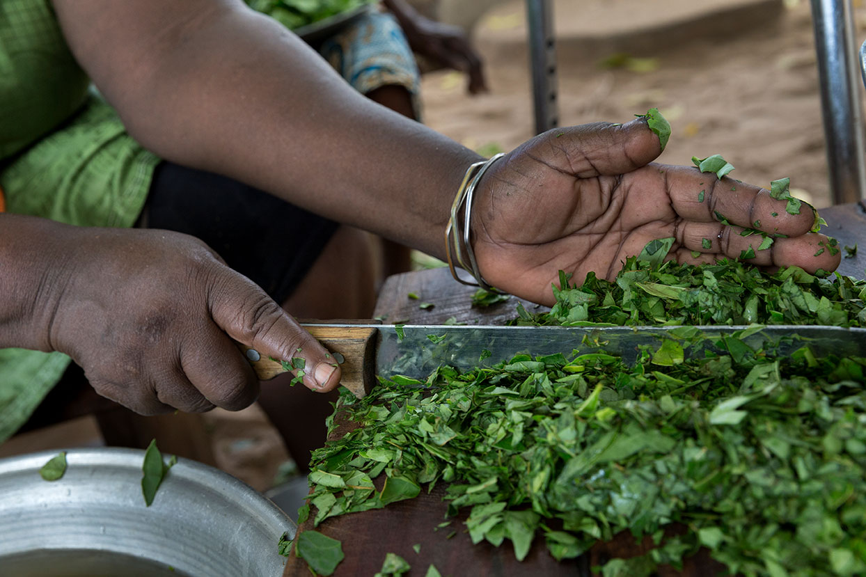 It is still early in the morning; the sun is barely above the horizon. Nevertheless, Cathérine Womas is already stirring four large aluminum pots and chopping vegetables: Onions, eggplants, green peppers and the leaves of the baobab tree are transformed between her nimble fingers into strips and cubes in no time at all. The charcoal burners under her pots radiate heat, steam rises from the simmering sauces. Despite all this, the 61-year-old looks completely relaxed. "I like to cook," she says, "especially the recipes that I learned from my grandmother." One example is Kondono, the sauce of Baobab leaves, which she enriches with small smoked fish.